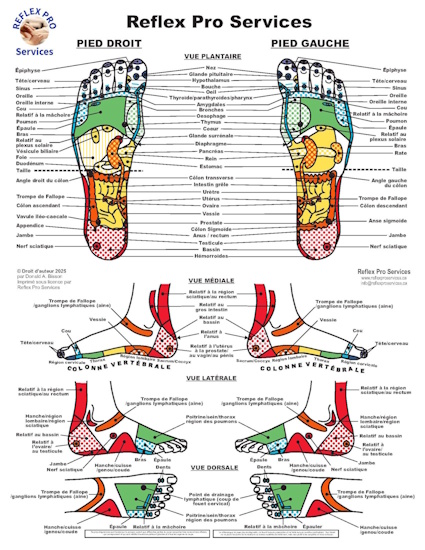 Professional FRENCH Reflexology Foot Chart in PDF format (French) in 8.5 x 11 inch format for easy printing.
