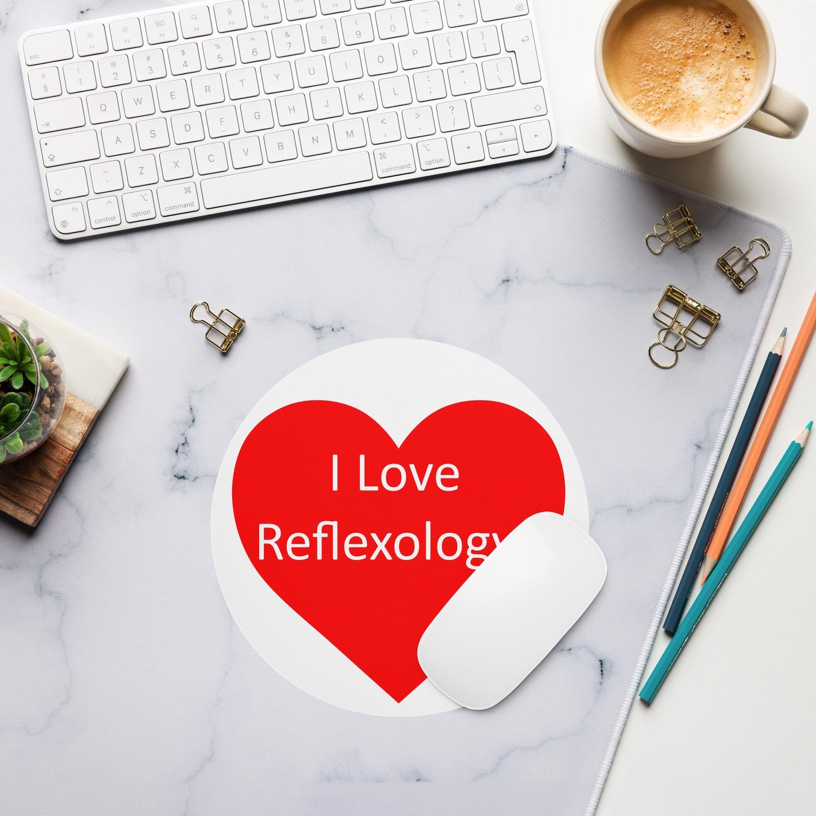 🖱️ Bring a touch of reflexology pride to your workspace with this beautifully printed 8-inch round mouse pad featuring the “I Love Reflexology” design.